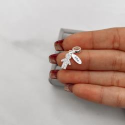 Descrição: Berloque pingente menino cravejado com placa escrito filho fabricado(a) em prata