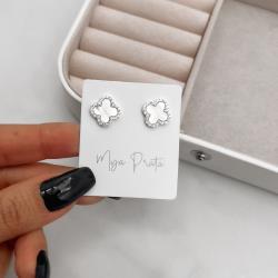 Brinco trevo madrepérola com cravejado 12mm | Mya Prata