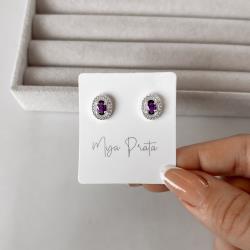 Brinco zircônia oval ametista com cravejado 11mm | Mya Prata