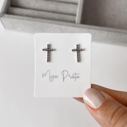 Brinco cruz fio bolinhas envelhecido 13mm | Mya Prata