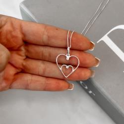 Colar pingente dois corações vazados com zircônia 21mm 45cm