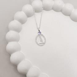 Colar medalha Nsa. Sra. Aparecida vazada cravejada zircônia lilás 20mm corrente cadeadinho 45cm | Mya Prata