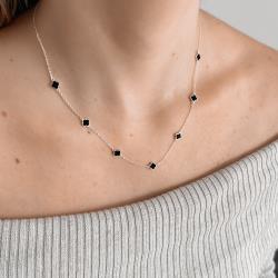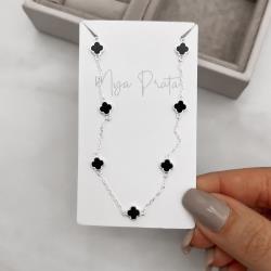 Colar entremeio trevos pedra ônix 6mm corrente cadeado 45+5cm | Mya Prata