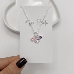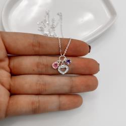 Colar entremeio círculo pingentes coração vazado cravejado, zircônias rosa e roxo corrente cadeadinho 40+5cm | Mya Prata