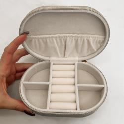 Porta-joias oval champanhe 14x9x4cm zíper dourado