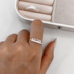 Descrição: Anel meia aliança cravejada detalhe escrito amor fabricado(a) em prata