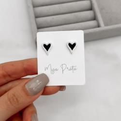 Brinco coração pedra ônix com cravejado 11mm | Mya Prata