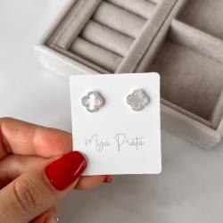 Brinco trevo madrepérola cravejado 10mm | Mya Prata