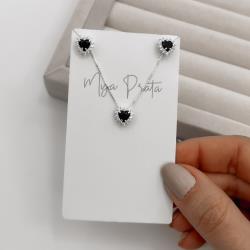 Conjunto brinco e colar zircônia coração ônix com cravejado 9mm 45cm | Mya Prata