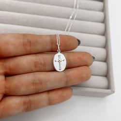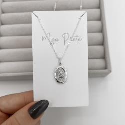 Colar pingente medalha dupla face Anjo da Guarda e cruz 16mm corrente cadeadinho 45cm | Mya Prata