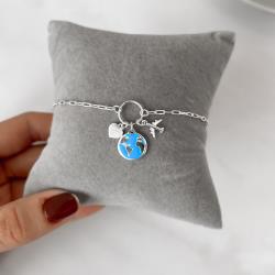 Pulseira entremeio círculo pingentes coração, planeta terra e avião | Mya Prata