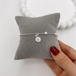 Pulseira entremeio pérolas com pingente medalha São Bento e zircônia correntes cadeado e cartier | Mya Prata